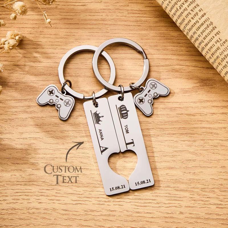 2 Personalized Couple Keychains Engraved Name and Date with Gamepad Charm Keyrings