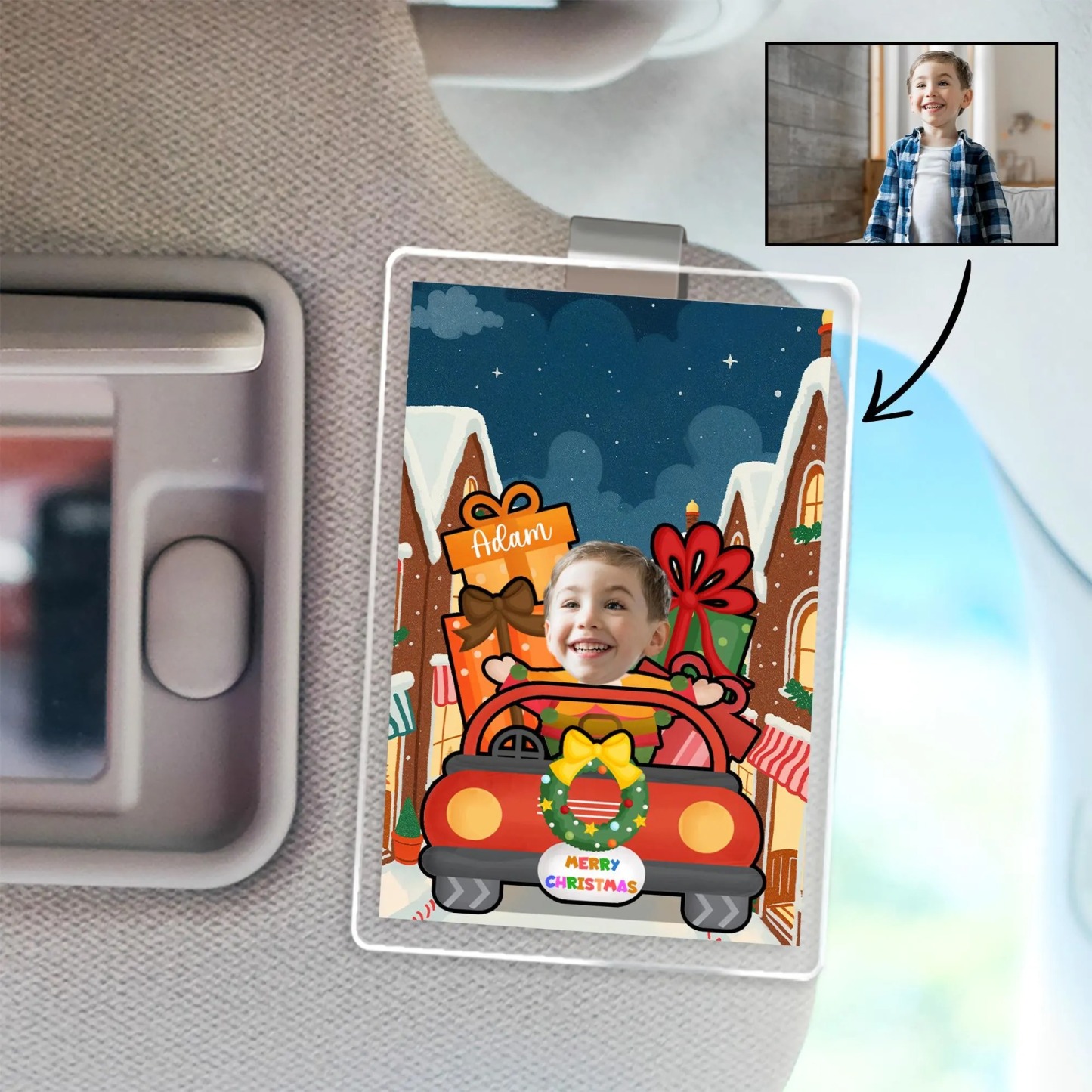 Custom Christmas Acrylic Visor Clip, Personalized Car Accessory Child Photo with Name, Funny Holiday Driving Gift Decoration, Christmas Gift